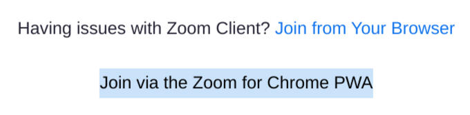After reaching the Zoom page, scroll to the bottom of the page and click "Join via the Zoom for Chrome PWA."