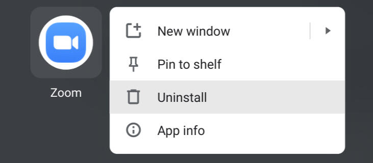 Zoom has had two previous apps on Chrome OS, both of which will no longer work in the very near future. These need to be removed from your machine.First, click on the three-dot menu at the top right side of the screen, go to "More Tools" and then select "Extensions." If you see Zoom anywhere, delete it.Also, open the "App Drawer" at the bottom of the screen, and look for Zoom. If you see any Zoom apps, right-click or long-press the app icon to uninstall it as seen below.